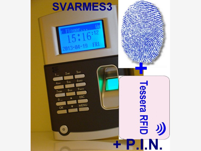 MARCATEMPO CON LETTORE DI BADGE DI PROSSIMITA' E LETTORE BIOMETRICO DI IMPRONTE DIGITALI MOD. SVARMES3 CON 50 TESSERE DI PROSSIMITA' - € 288,00