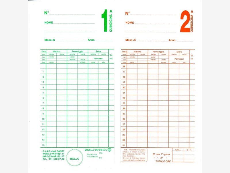 - schede e cartellini mensili bifacciali (lato 1: giorni 1/15, lato 2: giorni 16/31), larghezza mm. 85 per timbracartellini mod. Saody e per i seguenti orologi timbracartellini: