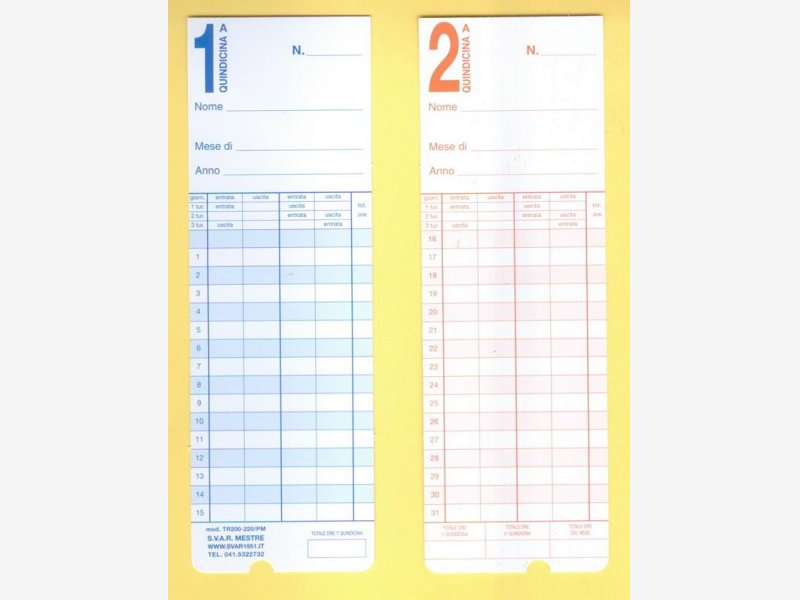 - schede e cartellini mensili bifacciali (lato 1: giorni 1/15, lato 2: giorni 16/31), per timbracartellini mod. TR200 TR220 e per i seguenti orologi timbracartellini: